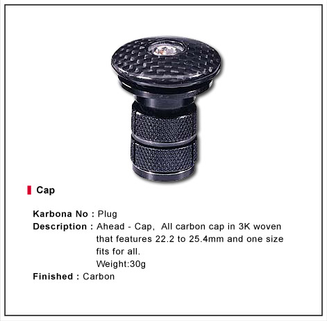 CapKarbona No: PlugDescription: Ahead - Cap, All carbon cap in 3k woven that features 22.2 to 25.4mm and one size fits for all. Weight: 30gFinished: Carbon